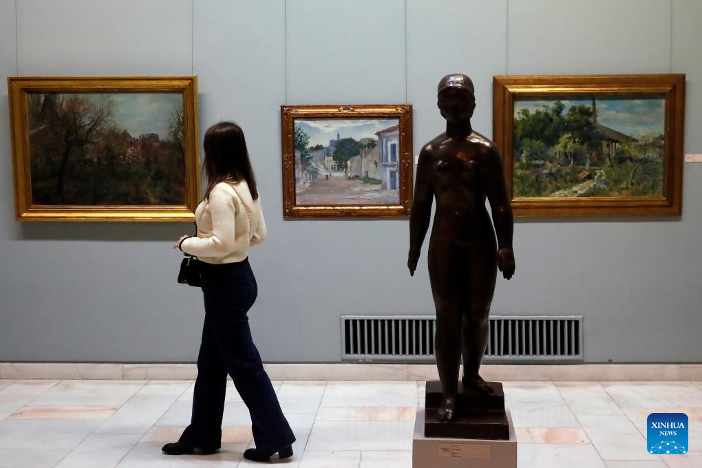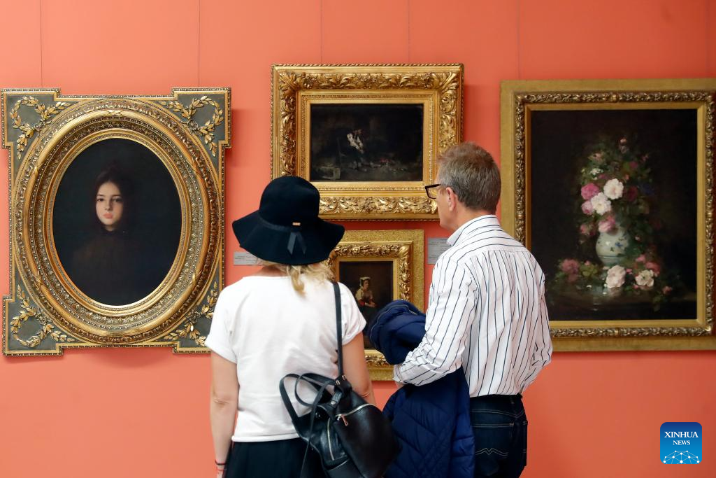 BUCAREST, 18 mayo, 2025 (Xinhua) -- Imagen del 17 de mayo de 2025 de una visitante observando obras de arte en el Museo Nacional de Arte de Rumanía durante el evento de la Noche Europea de los Museos, en Bucarest, Rumanía. Más de 75 museos, que reúnen 210 sedes de todo el país, participan en la 21 edición de la Noche Europea de los Museos 2025. (Xinhua/Cristian Cristel)