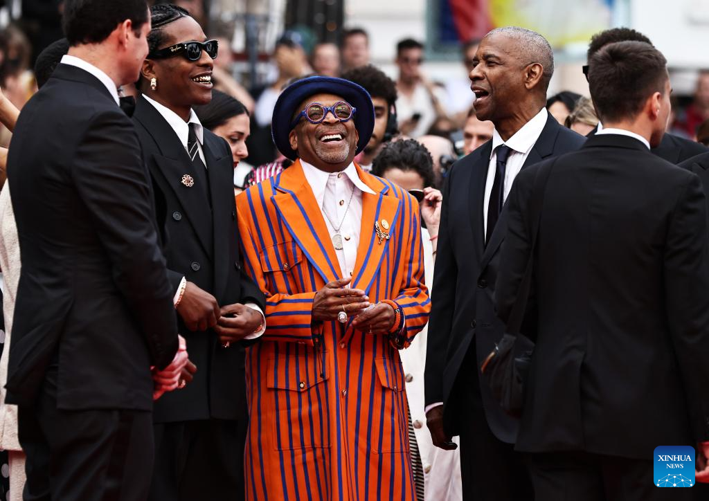CANNES, 20 mayo, 2025 (Xinhua) -- Imagen del 19 de mayo de 2025 del director estadounidense Spike Lee (4-d), llegando con miembros del reparto a la proyección de la película "Highest 2 Lowest" en la 78 edición del Festival de Cine de Cannes, en Cannes, en el sur de Francia. (Xinhua/Gao Jing)