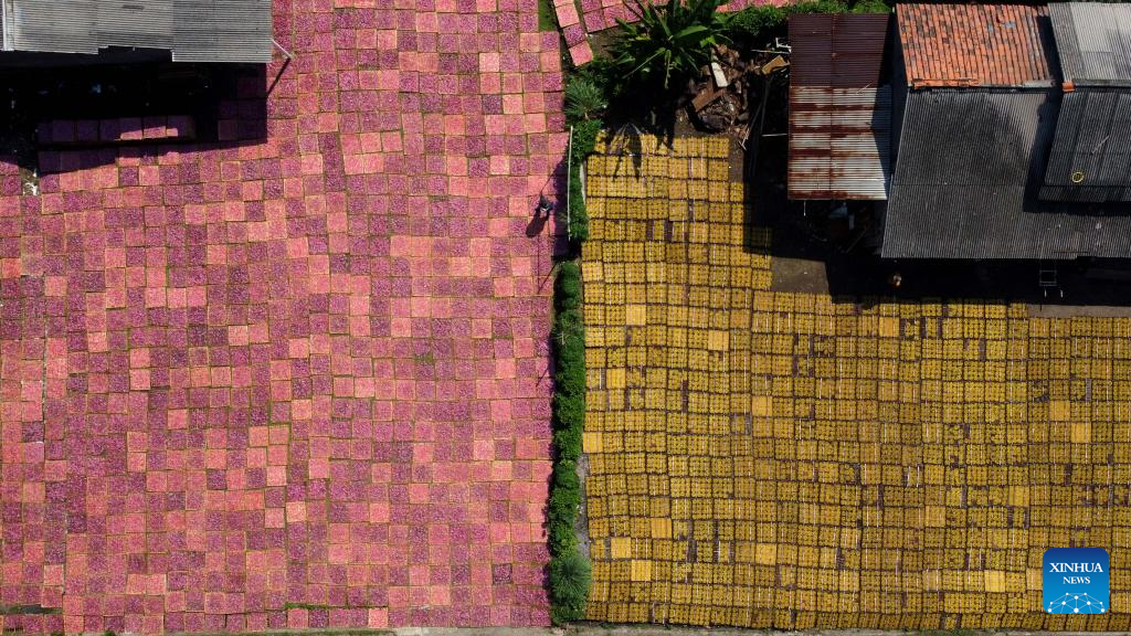 BOGOR, 28 mayo, 2025 (Xinhua) -- Vista aérea tomada con un dron de galletas rojas y amarillas tradicionales secándose en un taller casero, en la aldea de Karadenan, en la regencia de Bogor, Java Occidental, Indonesia, el 28 de mayo de 2025. (Xinhua/Yorri Farli)