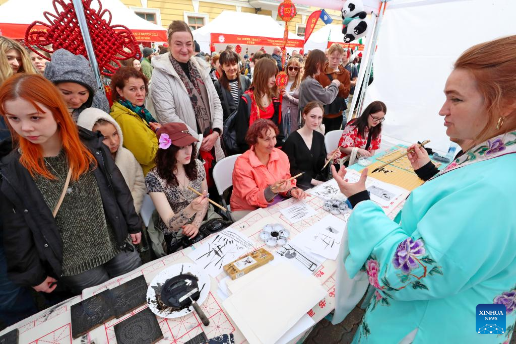MINSK, 1 junio, 2025 (Xinhua) -- Imagen del 31 de mayo de 2025 de personas probando la pintura tradicional china durante el evento cultural "Té para la Armonía: Salón Cultural Yaji", celebrado en Minsk, Bielorrusia. (Xinhua/Henadz Zhinkov)