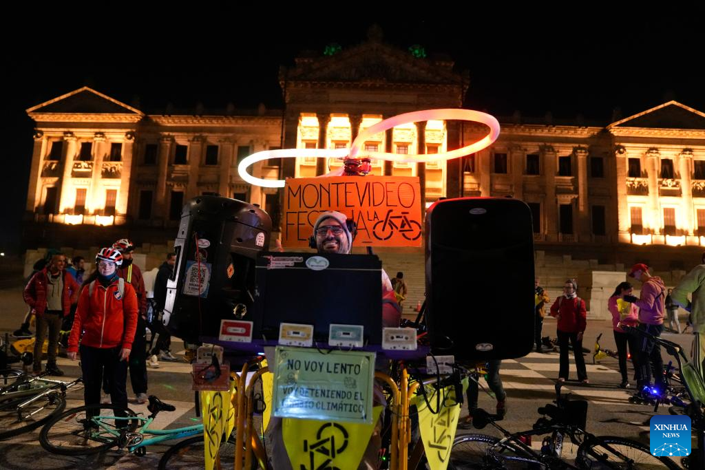 MONTEVIDEO, 4 junio, 2025 (Xinhua) -- Imagen del 3 de junio de 2025 de ciclistas participando en una actividad en el marco del Día Mundial de la Bicicleta, en el centro de Montevideo, capital de Uruguay. (Xinhua/Nicolás Celaya)