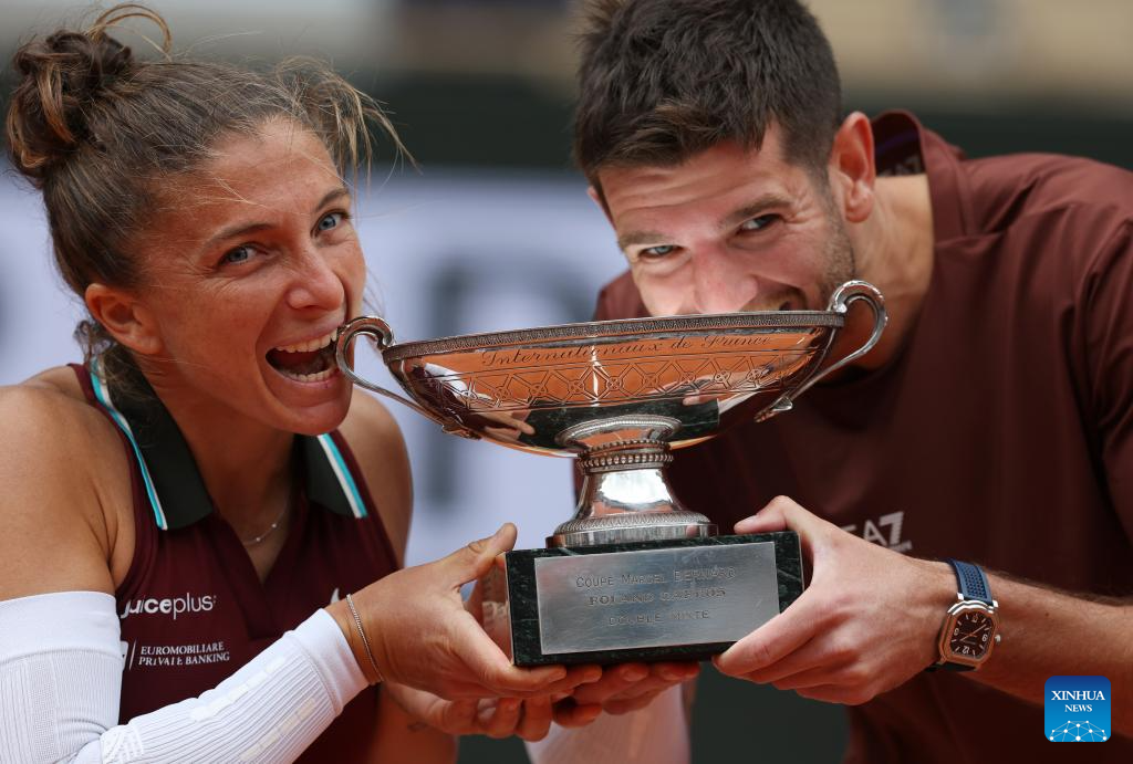 PARIS, 5 junio, 2025 (Xinhua) -- Sara Errani (i)/Andrea Vavassori festejan durante la ceremonia de premiación al término del partido de la final de dobles mixtos entre Taylor Townsend/Evan King, de Estados Unidos, y Sara Errani/Andrea Vavassori, de Italia, en el torneo de tenis Abierto de Francia, en Roland Garros, en París, Francia, el 5 de junio de 2025. (Xinhua/Gao Jing)