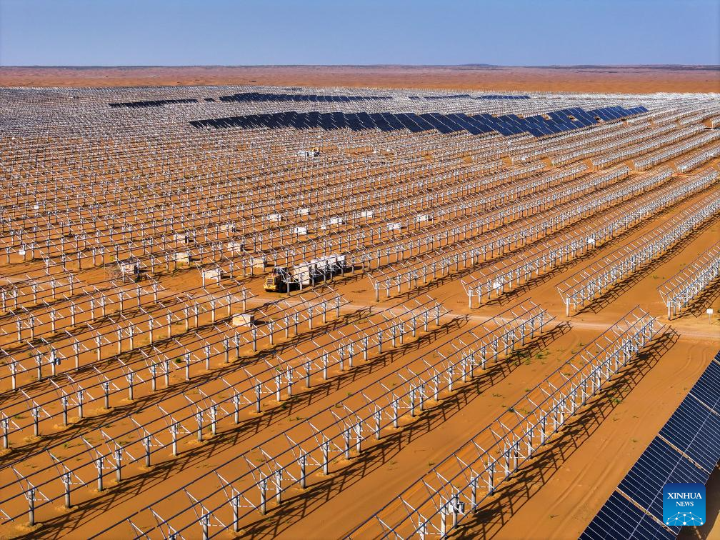 HOHHOT, 9 junio, 2025 (Xinhua) -- Vista aérea tomada con un dron el 7 de junio de 2025 de un proyecto fotovoltaico, en el Desierto de Kubuqi, en la región autónoma de Mongolia Interior, en el norte de China. En los desiertos de Kubuqi y Ulan Buh, el modelo de control de arena con proyectos fotovoltaicos se ha implementado ampliamente, transformando franjas de terreno arenoso en vastos "mares azules" rebosantes de energía verde. (Xinhua/Lian Zhen)