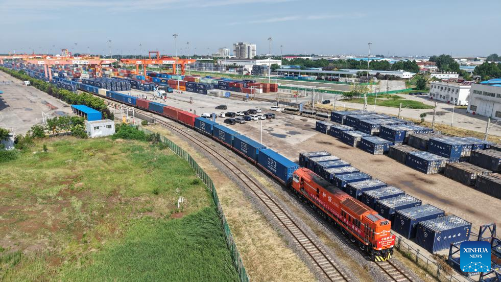 QINGDAO, 10 junio, 2025 (Xinhua) -- Vista aérea tomada con un dron del tren de carga China-Europa número 110.000 partiendo de la Estación del Ferrocarril de Jiaozhou, en Qingdao, en la provincia de Shandong, en el este de China, el 10 de junio de 2025. El tren de carga China-Europa número 110.000 partió el martes por la mañana desde la ciudad de Qingdao, marcando un hito en el desarrollo de alta calidad de este servicio. (Xinhua/Li Ziheng)