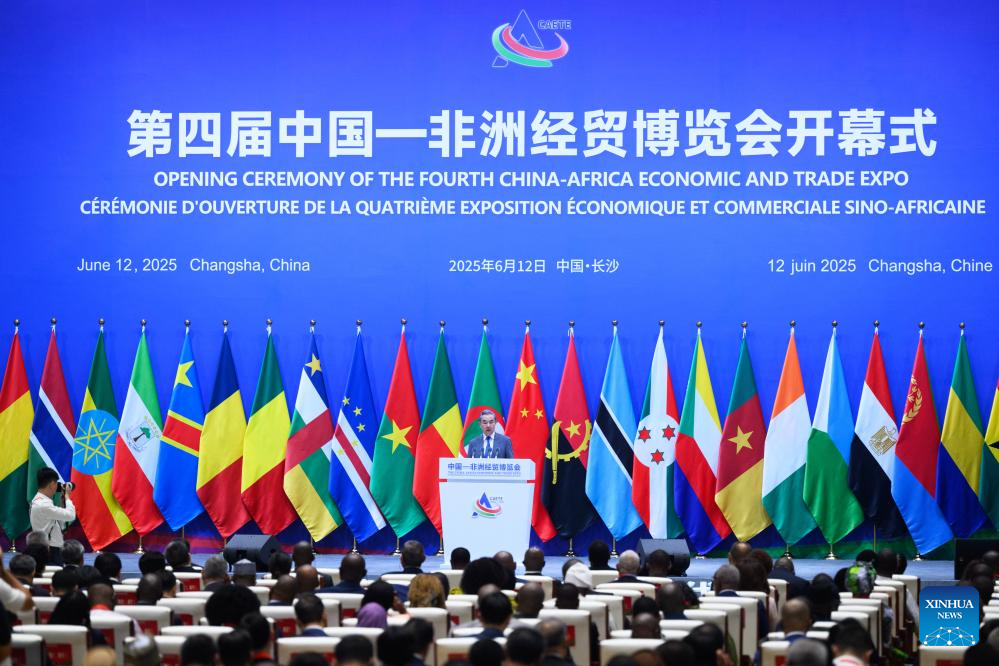 El ministro de Relaciones Exteriores chino, Wang Yi, también miembro del Buró Político del Comité Central del Partido Comunista de China, asiste a la ceremonia de apertura de la cuarta Exposición Económica y Comercial China-África y pronuncia un discurso, en Changsha, en la provincia de Hunan, en el centro de China, el 12 de junio de 2025. La cuarta Exposición Económica y Comercial China-África abrió sus puertas el jueves en la ciudad central china de Changsha. (Xinhua/Jin Liangkuai)