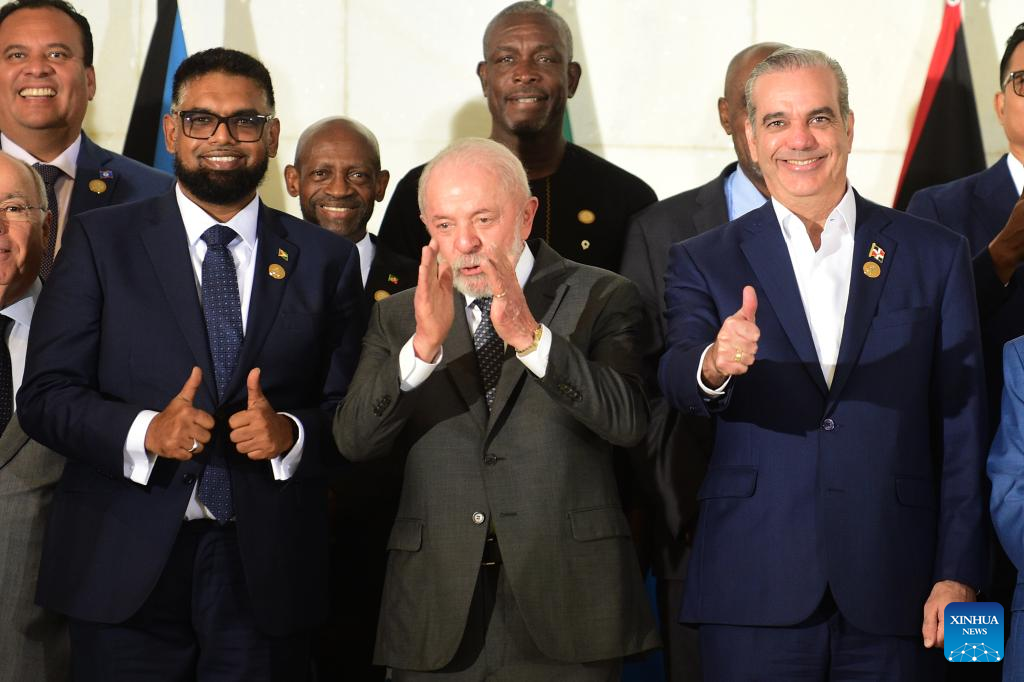BRASILIA, 13 junio, 2025 (Xinhua) -- El presidente brasileño, Luiz Inácio Lula da Silva (c-frente), reacciona junto al presidente de Guyana, Irfaan Ali (i-frente), y al presidente de República Dominicana, Luis Abinader (d-frente), durante la toma de la fotografía oficial previo a la apertura de la Cumbre Brasil-Caribe, en el Palacio de Itamaraty, en Brasilia, Brasil, el 13 de junio de 2025. Lula da Silva abrió el viernes la Cumbre Brasil-Caribe en el Palacio de Itamaraty, en la ciudad de Brasilia, en la que participan Jefes de Estado y de Gobierno, así como cancilleres, altas autoridades de 16 países y representantes de organizaciones regionales. (Xinhua/Lucio Tavora)
