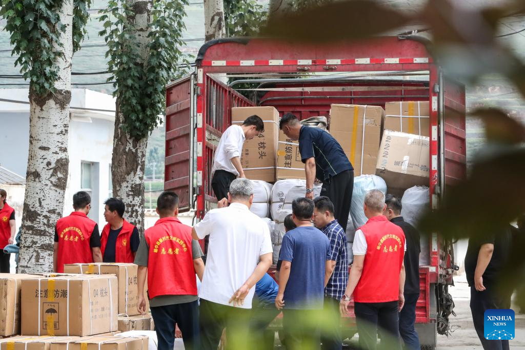 YUZHONG, 9 agosto, 2025 (Xinhua) -- Voluntarios descargan suministros de socorro en casos de desastre de un camión en una escuela convertida en un sitio de reasentamiento temporal, en el municipio de Gaoya del condado de Yuzhong, en la ciudad de Lanzhou, en la provincia de Gansu, en el noroeste de China, el 9 de agosto de 2025. El sitio de reasentamiento temporal ha recibido a más de 170 habitantes de la aldea de Maliantan, proporcionando dormitorios, ropa de cama, alimentos, agua potable, medicamentos y otros artículos de primera necesidad para apoyar la vida de los aldeanos afectados por las inundaciones. Las labores de rescate siguen en marcha luego de que lluvias fuertes y continuas provocaran torrentes de montaña en el condado de Yuzhong. Un total de 9.828 habitantes de Yuzhong han sido reubicados en zonas seguras y 443 personas de las que quedaron atrapadas han sido rescatadas, de acuerdo con una conferencia de prensa ofrecida por el Gobierno provincial el viernes por la noche. (Xinhua/Lang Bingbing)