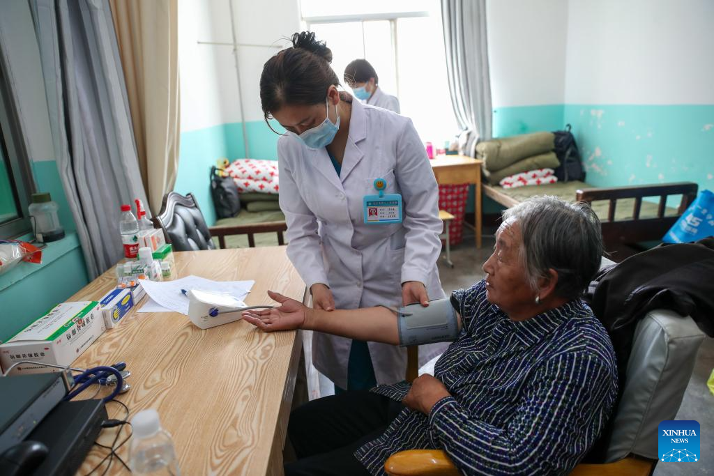 YUZHONG, 9 agosto, 2025 (Xinhua) -- Una trabajadora médica mide la presión arterial de una aldeana en una escuela convertida en un sitio de reasentamiento temporal, en el municipio de Gaoya del condado de Yuzhong, en la ciudad de Lanzhou, en la provincia de Gansu, en el noroeste de China, el 9 de agosto de 2025. El sitio de reasentamiento temporal ha recibido a más de 170 habitantes de la aldea de Maliantan, proporcionando dormitorios, ropa de cama, alimentos, agua potable, medicamentos y otros artículos de primera necesidad para apoyar la vida de los aldeanos afectados por las inundaciones. Las labores de rescate siguen en marcha luego de que lluvias fuertes y continuas provocaran torrentes de montaña en el condado de Yuzhong. Un total de 9.828 habitantes de Yuzhong han sido reubicados en zonas seguras y 443 personas de las que quedaron atrapadas han sido rescatadas, de acuerdo con una conferencia de prensa ofrecida por el Gobierno provincial el viernes por la noche. (Xinhua/Lang Bingbing)