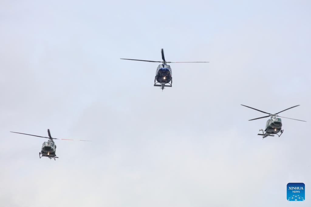 SAN SALVADOR, 15 septiembre, 2025 (Xinhua) -- Helicópteros de la Fuerza Aérea de El Salvador sobrevuelan el desfile por el 204 aniversario del Día de Independencia de El Salvador, en el departamento de San Salvador, capital de El Salvador, el 15 de septiembre de 2025. Miles de salvadoreños colmaron el lunes las calles de San Salvador, la capital, para conmemorar los 204 años de independencia de Centroamérica de España, en un desfile cívico militar que, pese a las lluvias nocturnas, inició puntualmente a las 8:00 hora local con un ambiente de música, color y orgullo nacional.(Xinhua/Alexander Peña)