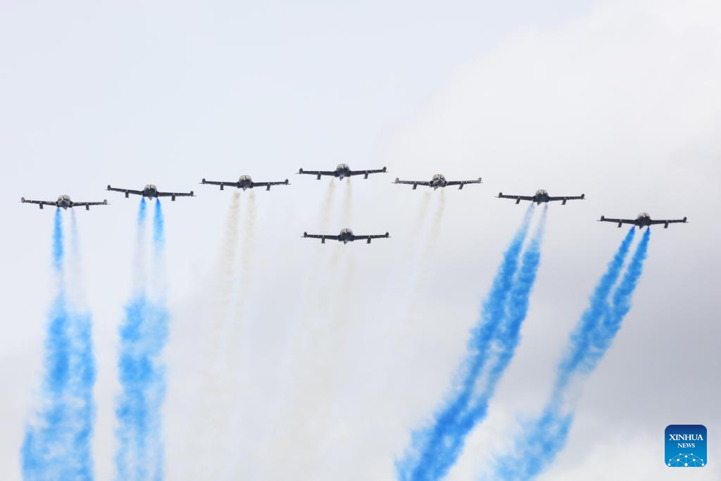 SAN SALVADOR, 15 septiembre, 2025 (Xinhua) -- Aviones de la Fuerza Aérea de El Salvador lanzan humo con los colores de la bandera nacional salvadoreña, mientras sobrevuelan el desfile por el 204 aniversario del Día de Independencia de El Salvador, en el departamento de San Salvador, capital de El Salvador, el 15 de septiembre de 2025. Miles de salvadoreños colmaron el lunes las calles de San Salvador, la capital, para conmemorar los 204 años de independencia de Centroamérica de España, en un desfile cívico militar que, pese a las lluvias nocturnas, inició puntualmente a las 8:00 hora local con un ambiente de música, color y orgullo nacional.(Xinhua/Alexander Peña)
