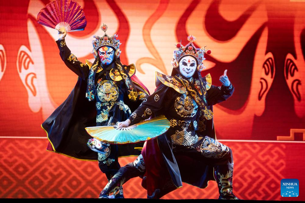 BUENOS AIRES, 27 septiembre, 2025 (Xinhua) -- Imagen del 26 de septiembre de 2025 de artistas representando un espectáculo de máscaras intercambiables de la ópera de Sichuan durante la feria de luces tradicionales chinas Tianfu Festival, en el predio ferial Tecnópolis, en la localidad de Villa Martelli, en la periferia noroeste de Buenos Aires, Argentina. El reconocido festival de linternas chinas Tianfu, una atractiva experiencia multisensorial basada en la cultura de China, fue inaugurado en Argentina, llenando de luz y color las noches primaverales en el país sudamericano. (Xinhua/Martín Zabala)