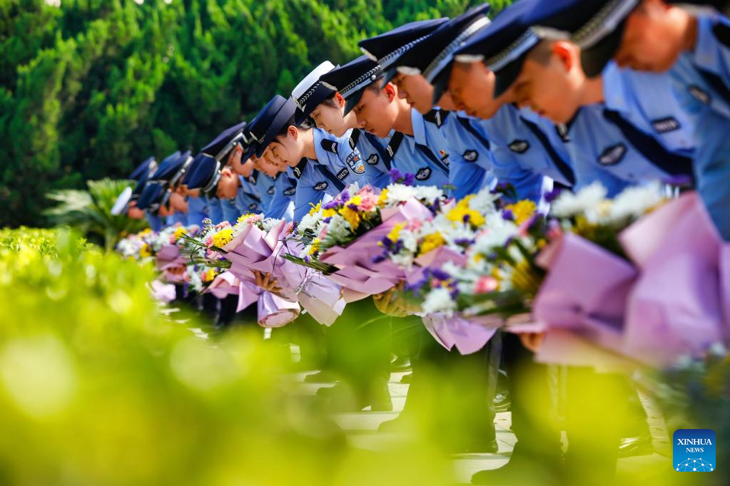 BEIJING, 30 septiembre, 2025 (Xinhua) -- Oficiales de policía presentan flores a los mártires en un cementerio, en Tianjin, en el norte de China, el 30 de septiembre de 2025. China celebró el martes su 12 Día de los Mártires con conmemoraciones realizadas en todo el país para honrar a los héroes nacionales caídos. (Xinhua/Du Penghui)
