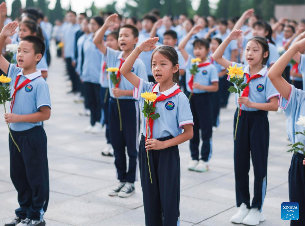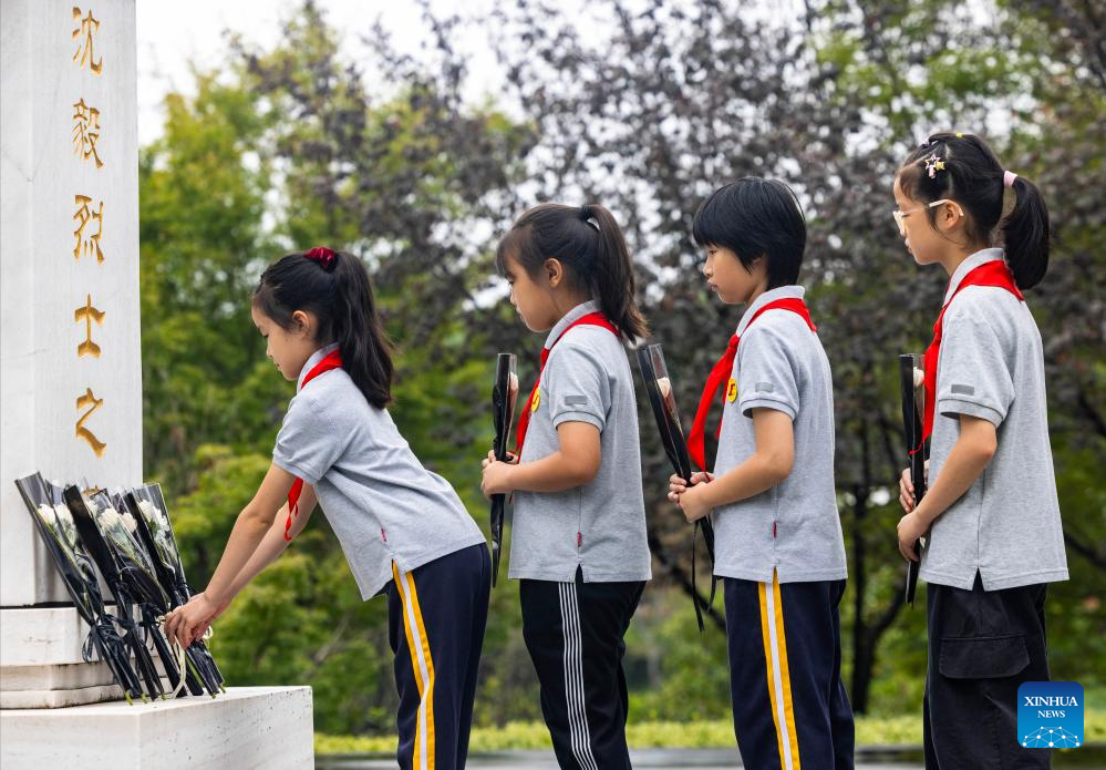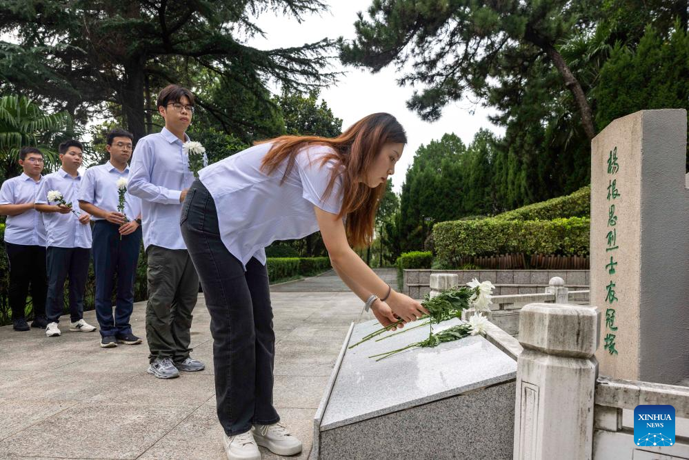 BEIJING, 30 septiembre, 2025 (Xinhua) -- Estudiantes presentan flores a un mártir en un cementerio, en Taizhou, en la provincia de Jiangsu, en el este de China, el 30 de septiembre de 2025. China celebró el martes su 12 Día de los Mártires con conmemoraciones realizadas en todo el país para honrar a los héroes nacionales caídos. (Xinhua/Tang Dehong)