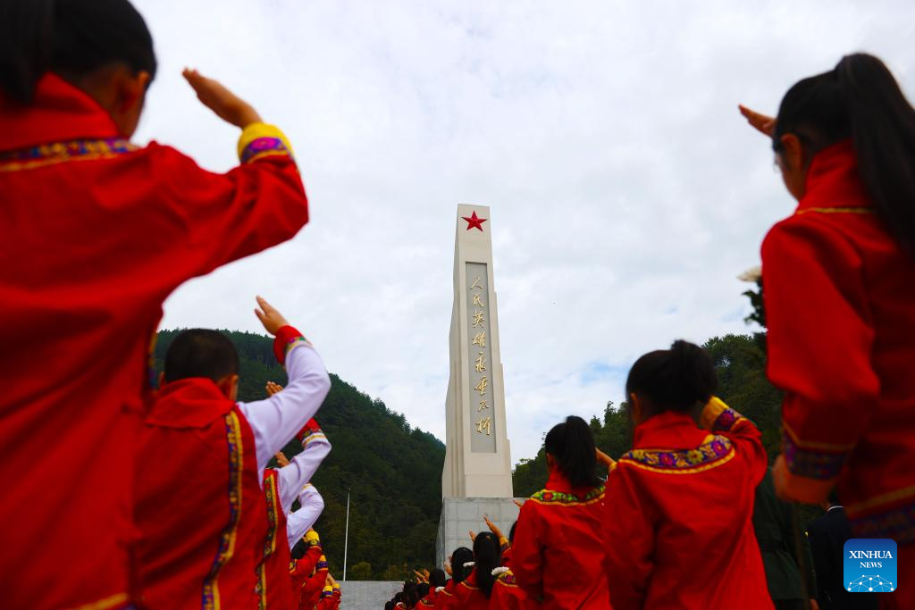 BEIJING, 30 septiembre, 2025 (Xinhua) -- Vista aérea tomada con un dron el 30 de septiembre de 2025 de estudiantes asistiendo a un evento conmemorativo en un cementerio para mártires, en el distrito de Ruyang, en la provincia de Henan, en el centro de China. China celebró el martes su 12 Día de los Mártires con conmemoraciones realizadas en todo el país para honrar a los héroes nacionales caídos. (Xinhua/Kang Hongjun)