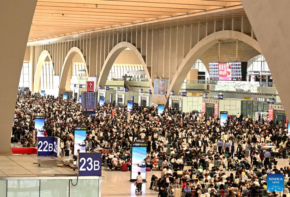 BEIJING, 1 octubre, 2025 (Xinhua) -- Pasajeros ingresan a la Estación de Ferrocarriles de Hankou, en Wuhan, en la provincia de Hubei, en el centro de China, el 1 de octubre de 2025. La red de transporte del país registró una temporada alta de viajes el primer día por las vacaciones del Día Nacional. (Xinhua/Xiao Yijiu)