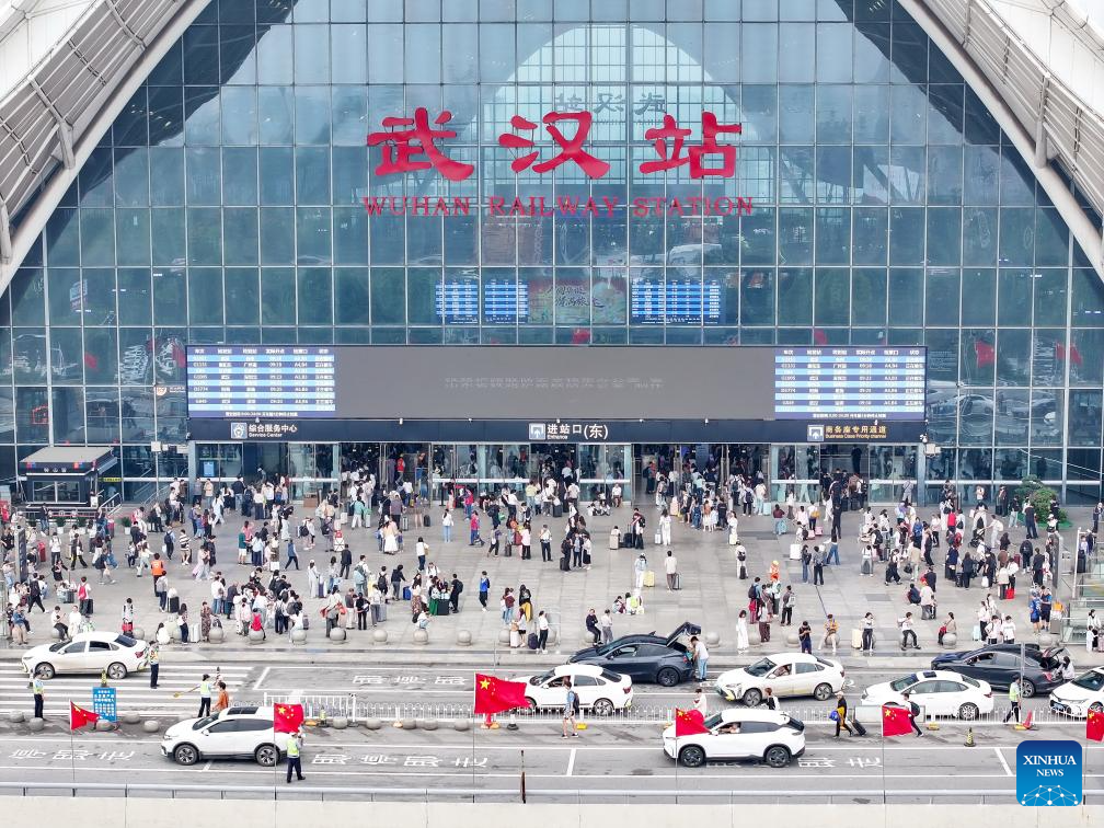 BEIJING, 1 octubre, 2025 (Xinhua) -- Vista aérea tomada con un dron el 1 de octubre de 2025 de personas en la entrada de la plaza este de la Estación de Ferrocarriles de Wuhan, en Wuhan, en la provincia de Hubei, en el centro de China. La red de transporte del país registró una temporada alta de viajes el primer día por las vacaciones del Día Nacional. (Xinhua/Zhao Jun)
