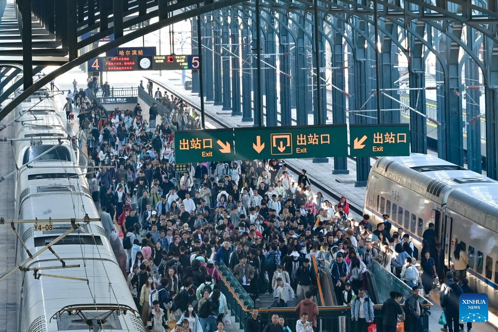BEIJING, 1 octubre, 2025 (Xinhua) -- Pasajeros son vistos en la Estación de Ferrocarriles de Harbin, en Harbin, en la provincia de Heilongjiang, en el noreste de China, el 1 de octubre de 2025. La red de transporte del país registró una temporada alta de viajes el primer día por las vacaciones del Día Nacional. (Xinhua/Yuan Yong)
