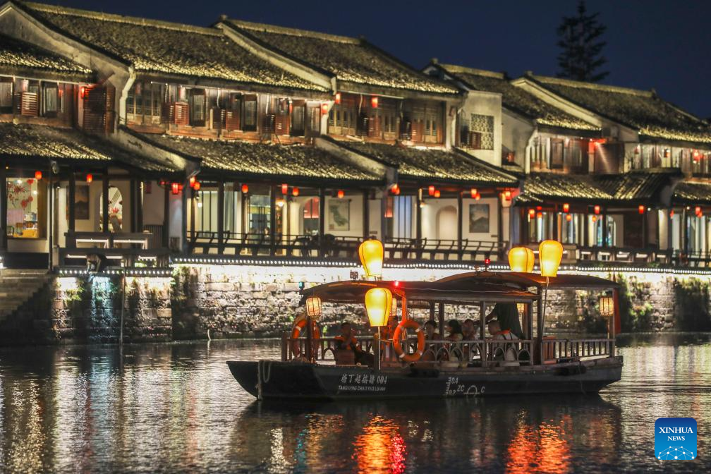 HANGZHOU, 3 octubre, 2025 (Xinhua) -- Imagen del 2 de octubre de 2025 de turistas tomando un paseo en bote para visitar el antiguo poblado de Tangqi, en Hangzhou, en la provincia de Zhejiang, en el este de China. El poblado ofrece a los turistas paseos nocturnos en bote y deslumbrantes linternas durante los ocho días de vacaciones por el Día Nacional y el Festival de Medio Otoño que comenzaron el miércoles. (Xinhua/Xu Yu)