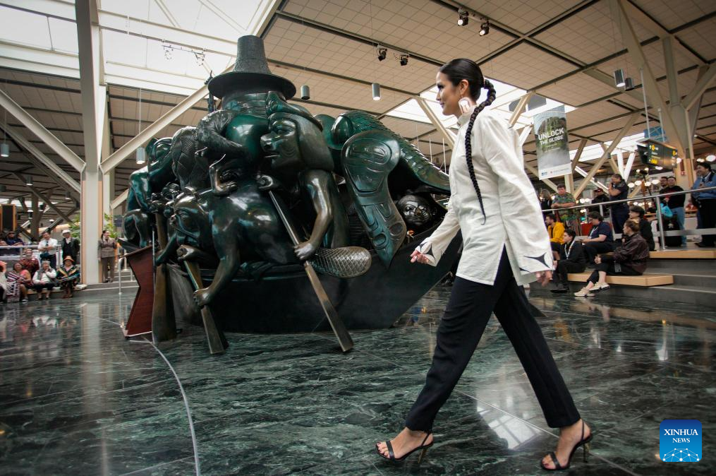 RICHMOND, 4 octubre, 2025 (Xinhua) -- Imagen del 3 de octubre de 2025 de una modelo presentando una creación de un diseñador indígena durante la vista previa del desfile de moda indígena llevada a cabo en la terminal del Aeropuerto Internacional de Vancouver, en Richmond, Columbia Británica, Canadá. El Aeropuerto Internacional de Vancouver llevó a cabo el viernes su primer desfile de moda indígena en colaboración con la Semana de la Moda Indígena de Vancouver (VIFW, por sus siglas en inglés), mostrando las últimas creaciones de diseñadores indígenas antes del evento principal de la VIFW que tendrá lugar en noviembre. (Xinhua/Liang Sen)