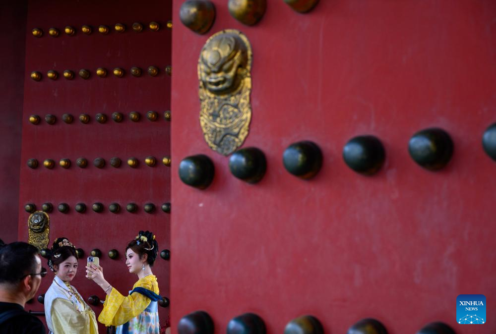 BEIJING, 4 octubre, 2025 (Xinhua) -- Imagen del 2 de octubre de 2025 de turistas portando trajes tradicionales mientras se toman fotografías en el Museo del Palacio, en Beijing, capital de China. Este año se celebra el centenario de la fundación del Museo del Palacio de China, también conocido como la Ciudad Prohibida. (Xinhua/Jin Liangkuai)