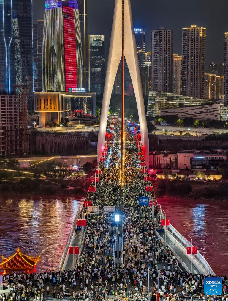 CHONGQING, 4 octubre, 2025 (Xinhua) -- Imagen del 3 de octubre de 2025 de turistas visitando el puente Qiansimen, en la municipalidad de Chongqing, en el suroeste de China. (Xinhua/Guo Xu)