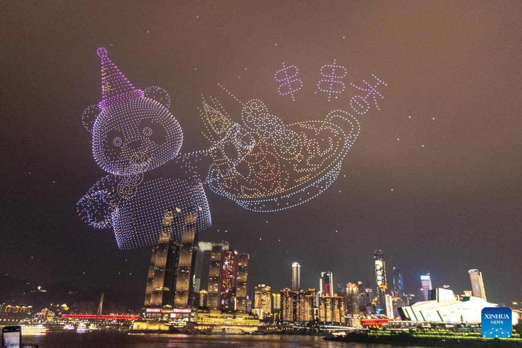 CHONGQING, 4 octubre, 2025 (Xinhua) -- Imagen del 2 de octubre de 2025 de un espectáculo de luces con drones, en la municipalidad de Chongqing, en el suroeste de China. (Xinhua/Huang Wei)