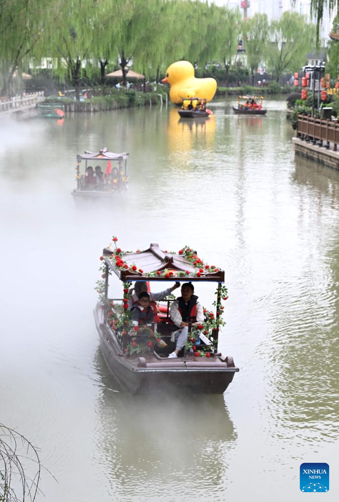 BEIJING, 4 octubre, 2025 (Xinhua) -- Imagen del 3 de octubre de 2025 de personas visitando el antiguo poblado de Hexia, en Huai'an, en la provincia de Jiangsu, en el este de China. Los destinos turísticos de toda China están experimentando un aumento en el número de visitantes desde el miércoles con el comienzo de las vacaciones de ocho días por el Día Nacional y el Festival de Medio Otoño. (Xinhua/Chen Qibao)