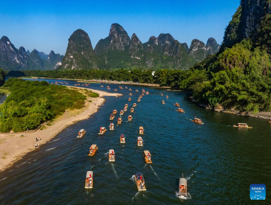 BEIJING, 4 octubre, 2025 (Xinhua) -- Vista aérea tomada con un dron el 4 de octubre de 2025 de turistas disfrutando del paisaje en balsas de bambú a lo largo del río Lijiang, en el distrito de Yangshuo, en la región autónoma de la etnia zhuang de Guangxi, en el sur de China. Los destinos turísticos de toda China están experimentando un aumento en el número de visitantes desde el miércoles con el comienzo de las vacaciones de ocho días por el Día Nacional y el Festival de Medio Otoño. (Xinhua/Liu Zheng)