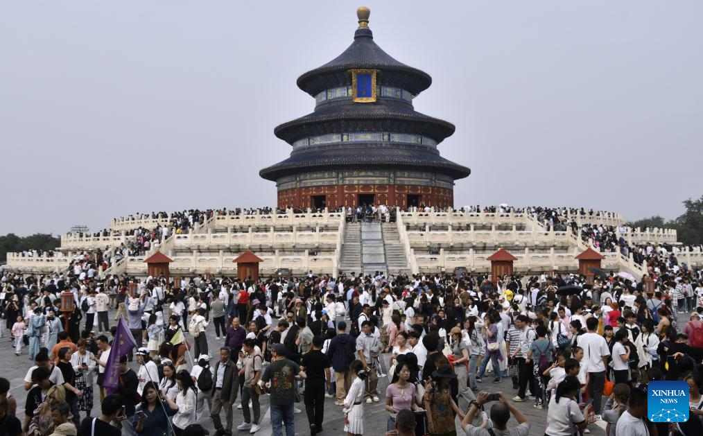 BEIJING, 4 octubre, 2025 (Xinhua) -- Personas visitan el Templo del Cielo, en Beijing, capital de China, el 4 de octubre de 2025. Los destinos turísticos de toda China están experimentando un aumento en el número de visitantes desde el miércoles con el comienzo de las vacaciones de ocho días por el Día Nacional y el Festival de Medio Otoño. (Xinhua/Li Xin)