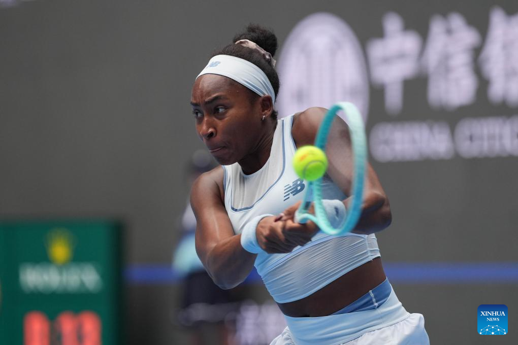 BEIJING, 4 octubre, 2025 (Xinhua) -- Coco Gauff devuelve la pelota durante el partido de semifinal de individuales femeninos entre Coco Gauff, de Estados Unidos, y Amanda Anisimova, de Estados Unidos, en el torneo de tenis China Open 2025, en Beijing, China, el 4 de octubre de 2025. (Xinhua/Xie Han)
