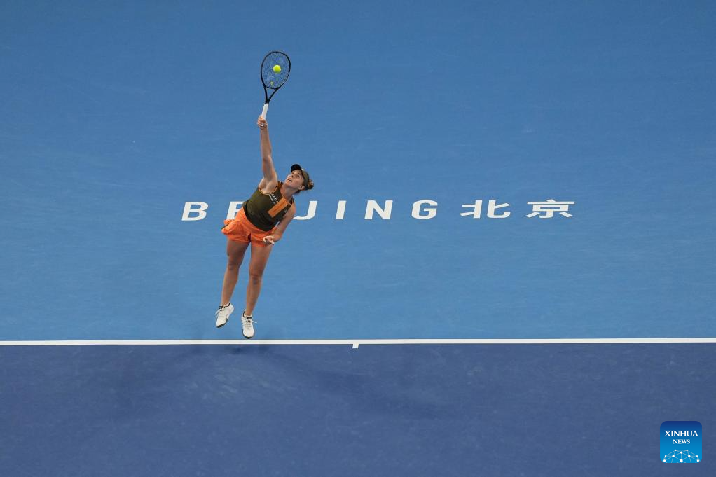 BEIJING, 4 octubre de 2025 (Xinhua) -- Linda Noskova sirve la pelota durante el partido de semifinales de individuales femeninos entre Linda Noskova, de la República Checa, y Jessica Pegula, de Estados Unidos, en el torneo de tenis China Open 2025, en Beijing, China, el 4 de octubre de 2025. (Xinhua/Xie Han)