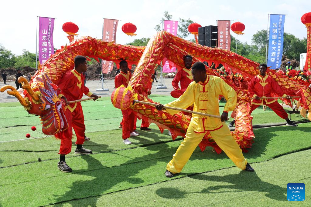 ACRA, 5 octubre, 2025 (Xinhua) -- Imagen del 4 de octubre de 2025 de residentes realizando una presentación de una danza del dragón durante una ceremonia de colocación de primera piedra para el comienzo del Parque de Atracciones Internacional Bright, en Afienya, en la Región de Gran Acra, Ghana. Una ceremonia de colocación de la primera piedra de un parque de atracciones ultramoderno construido por Greenhouse International Development Group, una empresa china, se celebró el sábado en Afienya, cerca de la ciudad portuaria de Tema, en Ghana. (Xinhua/Seth)