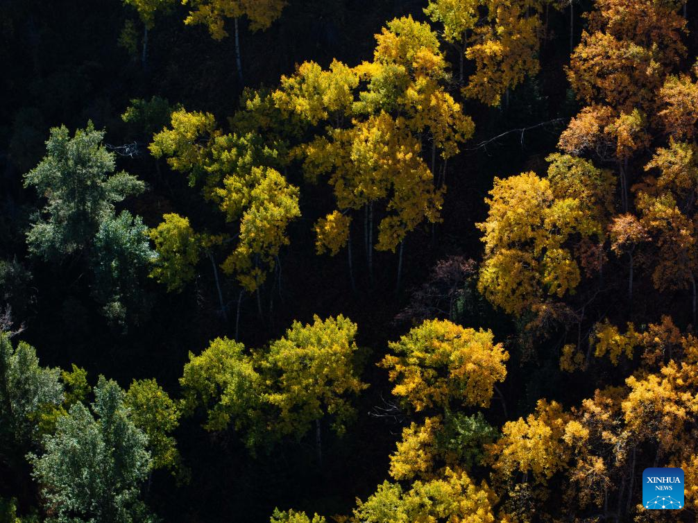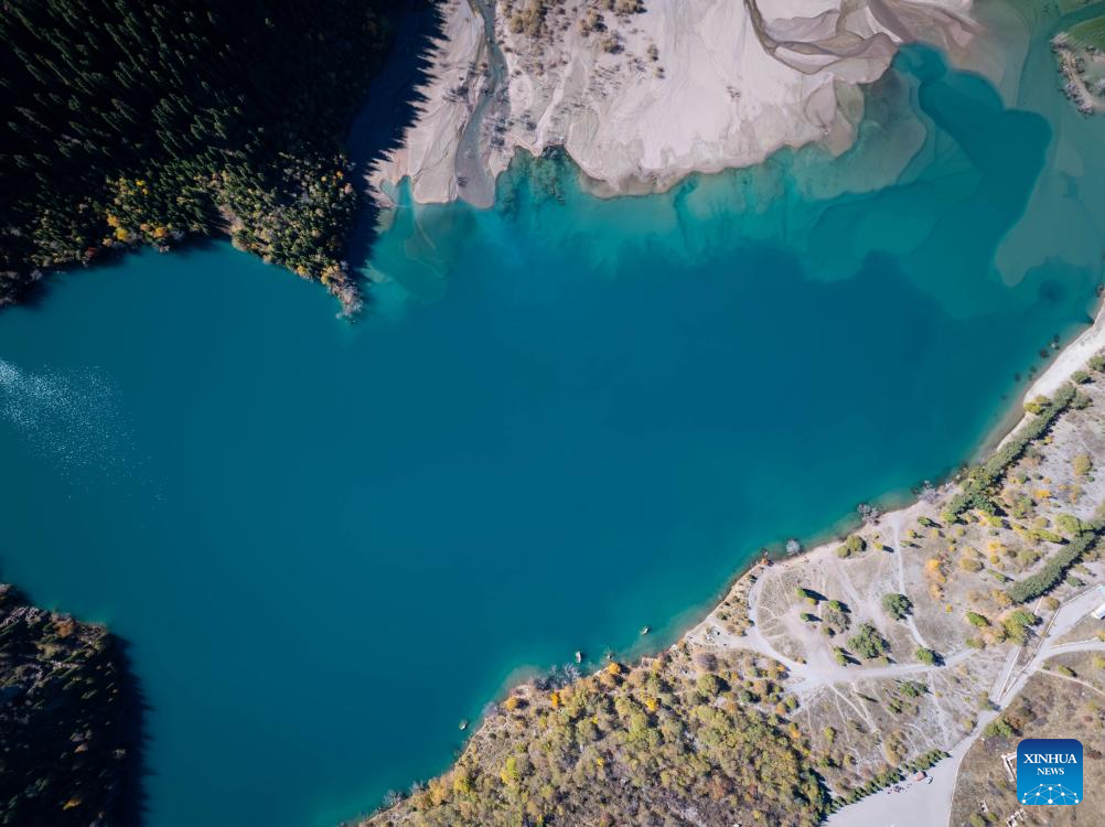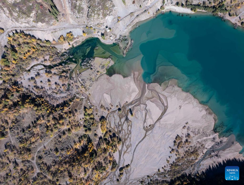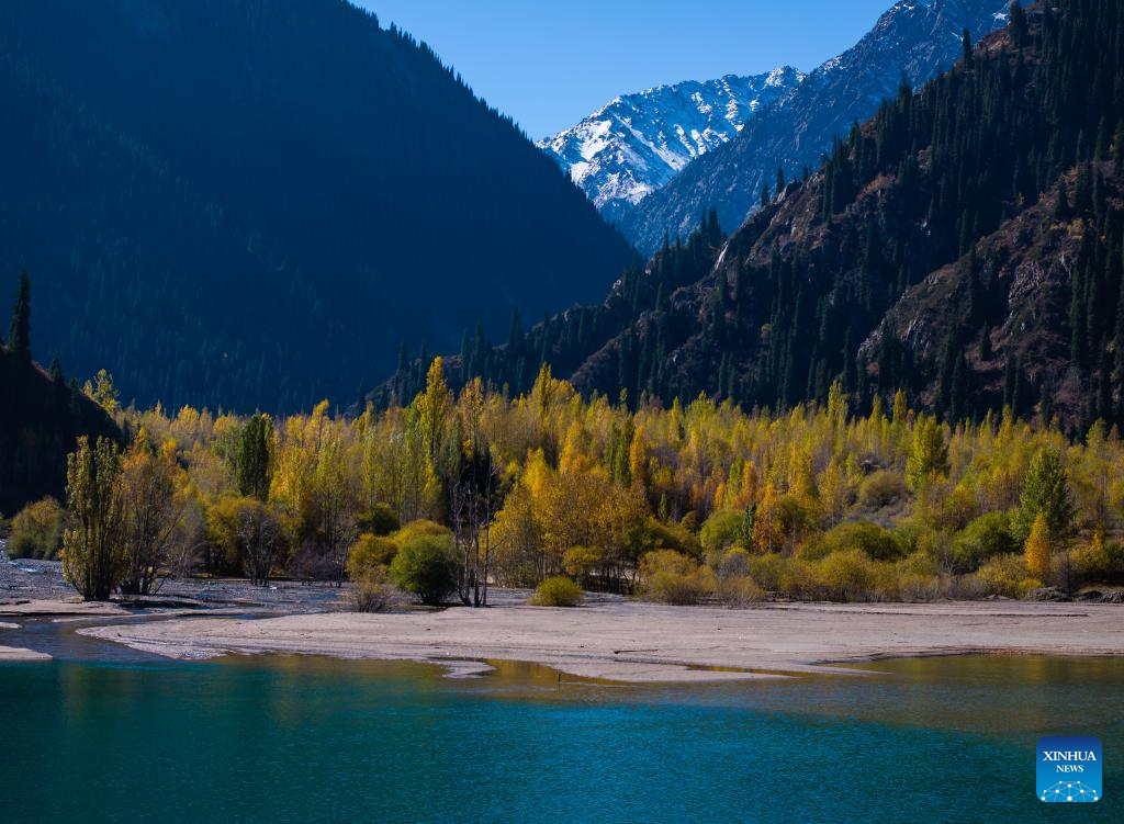 REGION DE ALMATY, 5 octubre, 2025 (Xinhua) -- Vista aérea del 4 de octubre de 2025 del paisaje otoñal de la garganta de Issyk, en la región de Almaty, Kazajistán. La garganta de Issyk y el lago Issyk, situados en la región de Almaty, Kazajistán, son destinos turísticos famosos. El hermoso lago, las majestuosas montañas nevadas y el desfiladero, junto con el vibrante follaje, pintan un idílico paisaje otoñal. (Xinhua/Li Renzi)