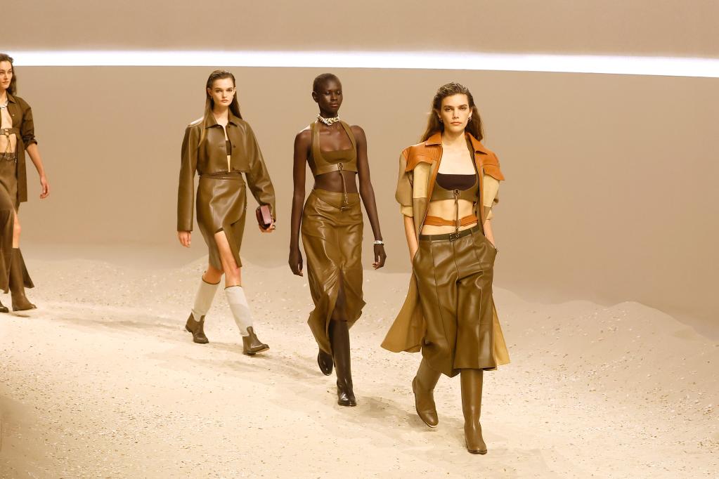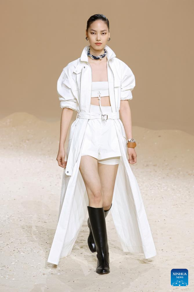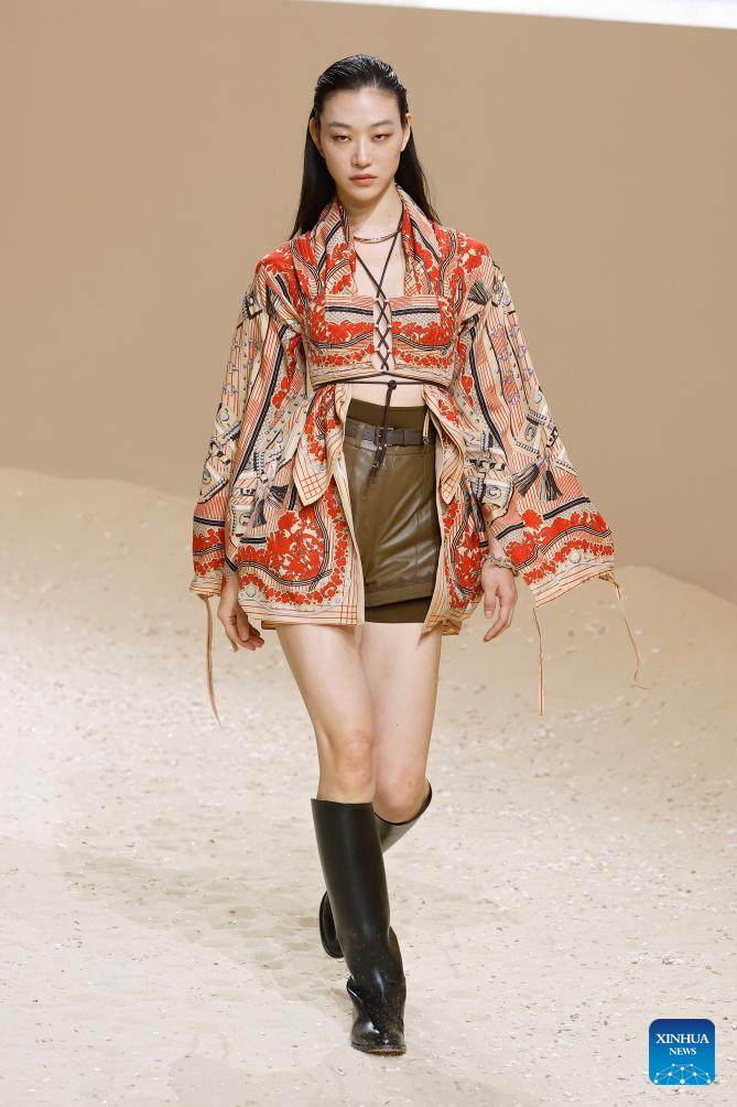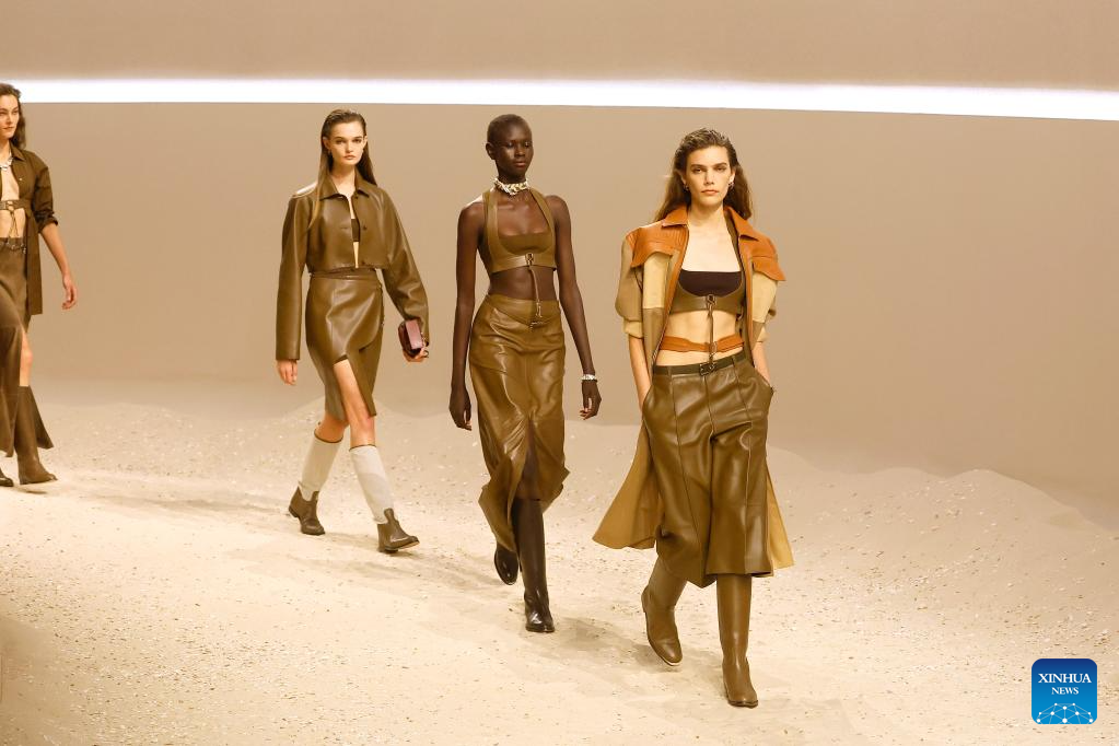 PARIS, 5 octubre, 2025 (Xinhua) -- Imagen del 4 de octubre de 2025 de modelos presentando creaciones de las colecciones listas para usar Primavera/Verano 2026 de Hermes durante la Semana de la Moda de París, en París, Francia. (Xinhua/MeetEurope)