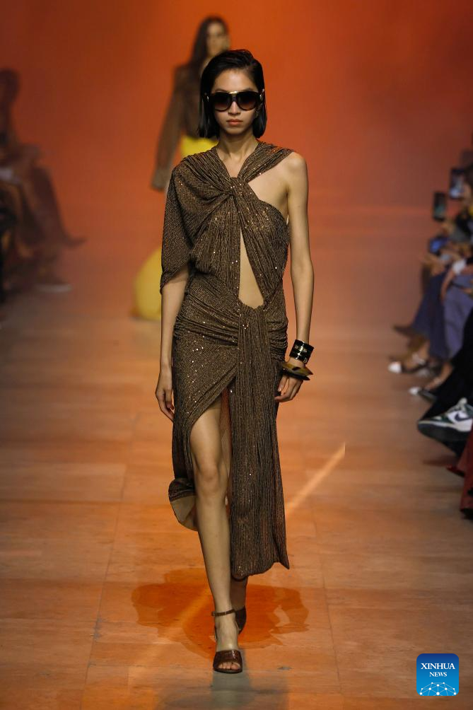PARIS, 5 octubre, 2025 (Xinhua) -- Imagen del 4 de octubre de 2025 de una modelo presentando una creación de las colecciones listas para usar Primavera/Verano 2026 de Hermes durante la Semana de la Moda de París, en París, Francia. (Xinhua/MeetEurope)