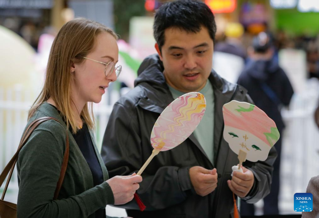 RICHMOND, 5 octubre, 2025 (Xinhua) -- Imagen del 4 de octubre de 2025 de personas participando en un taller de fabricación de abanicos durante la celebración del Festival del Medio Otoño en un centro comercial, en Richmond, Columbia Británica, Canadá. (Xinhua/Liang Sen)