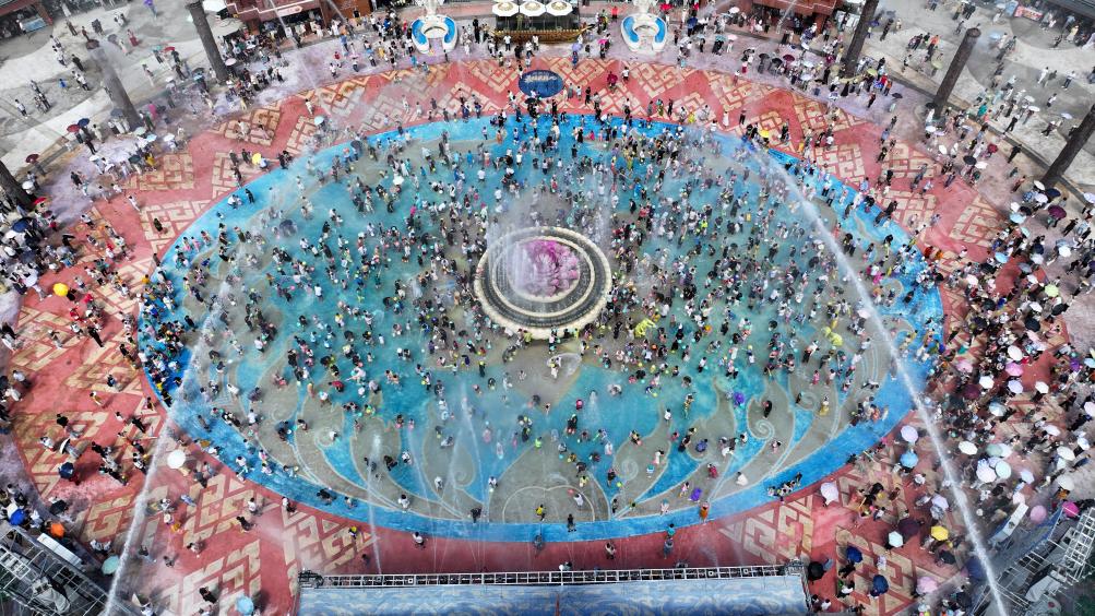 JINGHONG, 5 octubre, 2025 (Xinhua) -- Vista aérea tomada con un dron el 5 de octubre de 2025 de turistas participando en un evento de salpicaduras de agua en un punto escénico, en la ciudad de Jinghong, en la provincia de Yunnan, en el suroeste de China. Los destinos turísticos de toda China están experimentando un aumento en el número de visitantes desde que el miércoles comenzó el feriado de ocho días por el Día Nacional y el Festival del Medio Otoño. (Xinhua/Li Yunsheng)