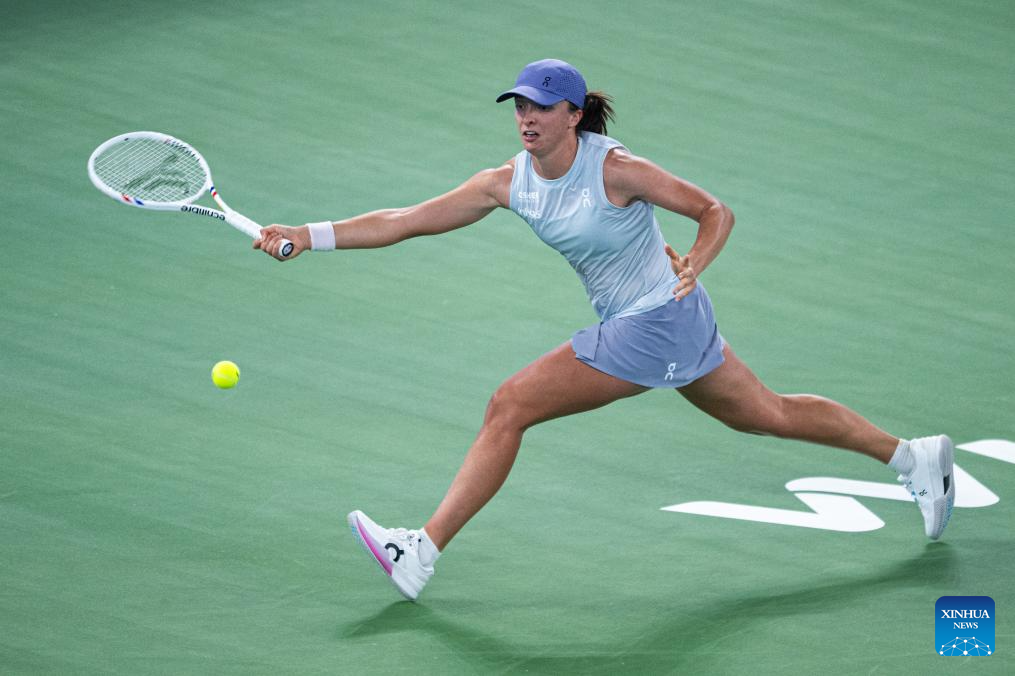 WUHAN, 7 octubre, 2025 (Xinhua) -- Iga Swiatek, de Polonia, devuelve la pelota durante el partido de dieciseisavos de final de individuales femeninos ante Marie Bouzkova, de República Checa, en el torneo de tenis Wuhan Open 2025, en Wuhan, en la provincia de Hubei, en el centro de China, el 7 de octubre de 2025. (Xinhua/Xiao Yijiu)