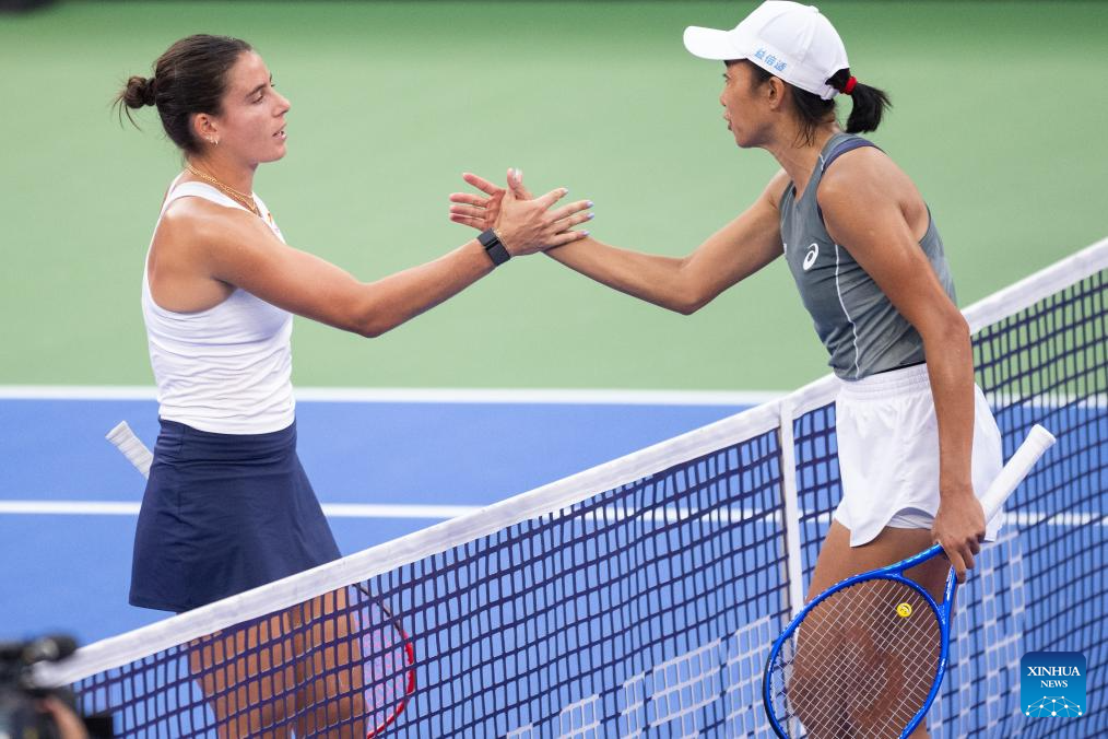 WUHAN, 7 octubre, 2025 (Xinhua) -- Zhang Shuai (d), de China, saludando a Emma Navarro, de Estados Unidos, al término de su partido de treintaidosavos de individuales femeninos en el torneo de tenis Wuhan Open 2025, en Wuhan, en la provincia de Hubei, en el centro de China, el 7 de octubre de 2025. (Xinhua/Xiao Yijiu)