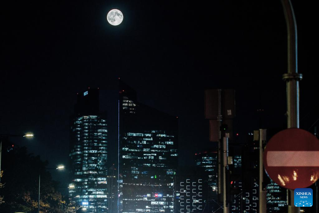 VARSOVIA, 7 octubre, 2025 (Xinhua) -- La luna llena es vista sobre Varsovia, Polonia, el 7 de octubre de 2025. (Xinhua/Aleksy Witwicki)