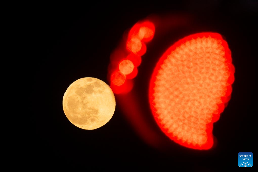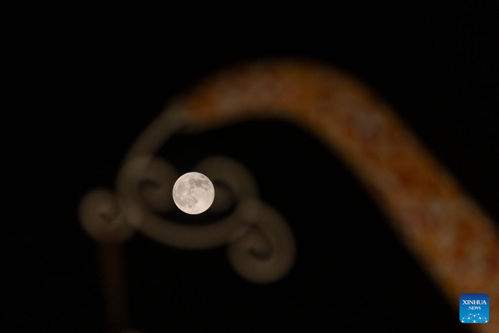 BAKU, 7 octubre, 2025 (Xinhua) -- Imagen del 6 de octubre de 2025 de la luna llena vista en el cielo sobre Bakú, Azerbaiyán. (Xinhua/Chen Junfeng)