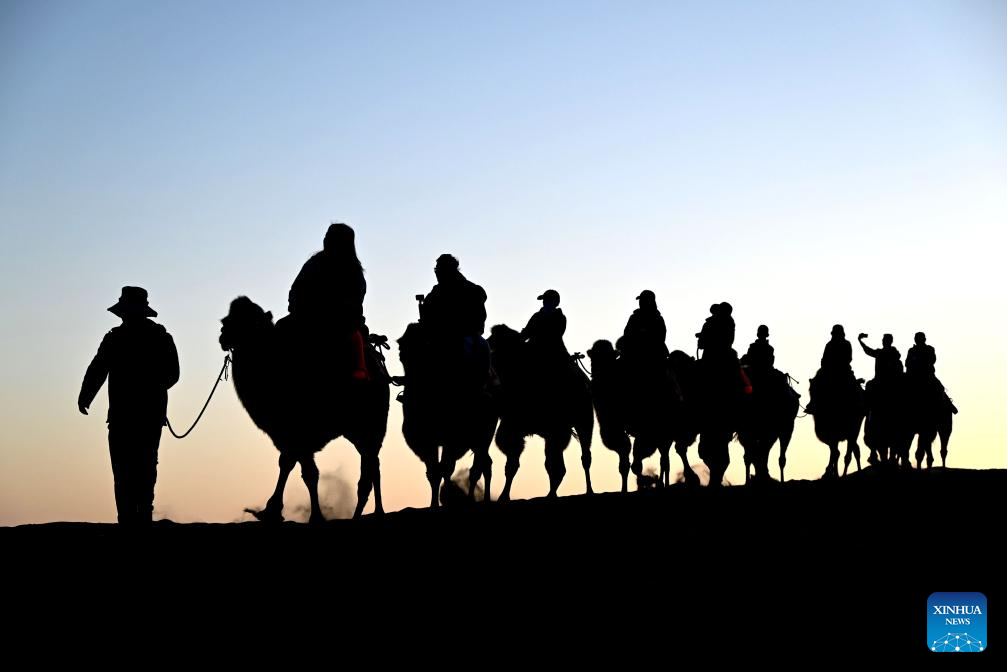Imagen del 1 de octubre de 2025 de personas montando camellos en el áea escénica del Manantial de la Luna Creciente y la Duna de Arena Mingsha, en Dunhuang, en la provincia de Gansu, en el noroeste de China. China registró 888 millones de viajes turísticos dentro del territorio nacional durante los ocho días de vacaciones con motivo del Día Nacional y el Festival del Medio Otoño, lo que constituye un aumento de 123 millones frente a las vacaciones de siete días del Día Nacional en 2024, informó hoy jueves el Ministerio de Cultura y Turismo. (Xinhua/Zhang Xiaoliang)