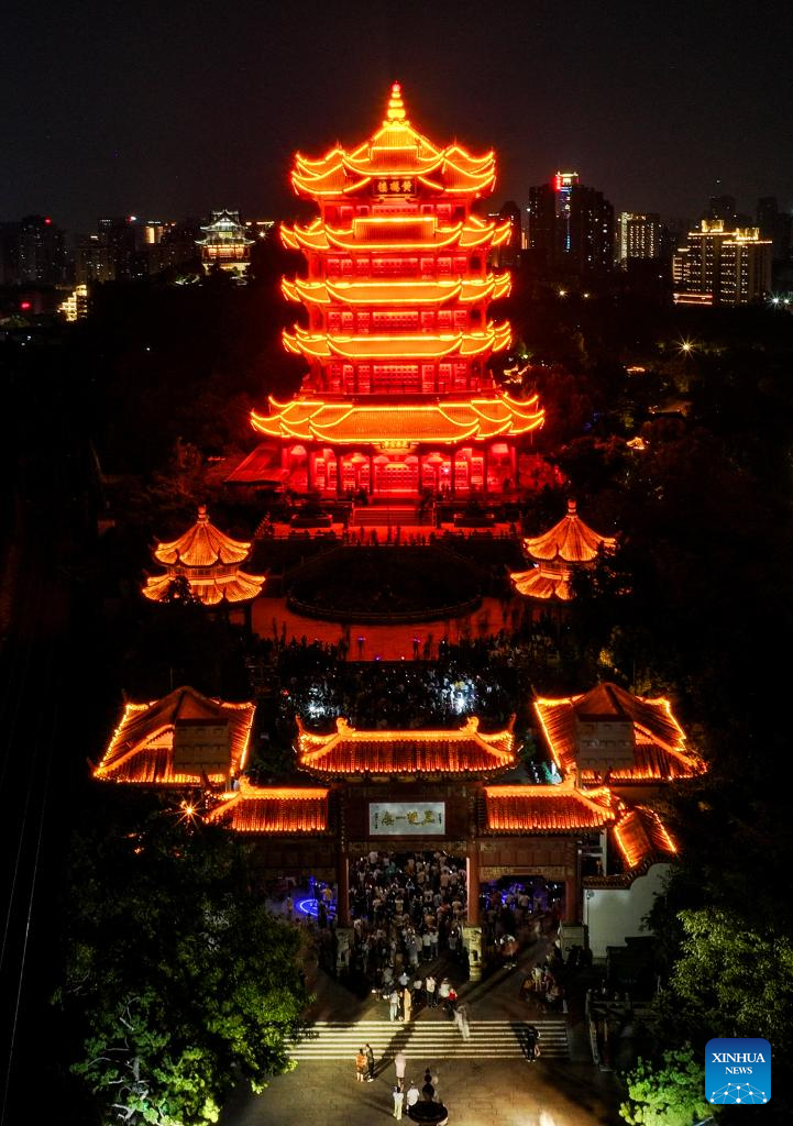 Vista aérea tomada con un dron el 7 de octubre de 2025 de personas visitando la Torre de la Grulla Amarilla, en Wuhan, en la provincia de Hubei, en el centro de China. China registró 888 millones de viajes turísticos dentro del territorio nacional durante los ocho días de vacaciones con motivo del Día Nacional y el Festival del Medio Otoño, lo que constituye un aumento de 123 millones frente a las vacaciones de siete días del Día Nacional en 2024, informó hoy jueves el Ministerio de Cultura y Turismo. (Xinhua/Chen Yehua)