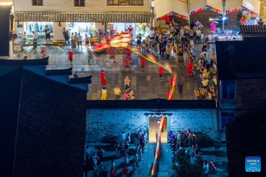 Vista aérea tomada con un dron el 5 de octubre de 2025 de personas observando un desfile de dragones en bancos de madera, en el distrito de Pujiang, en la provincia de Zhejiang, en el este de China. China registró 888 millones de viajes turísticos dentro del territorio nacional durante los ocho días de vacaciones con motivo del Día Nacional y el Festival del Medio Otoño, lo que constituye un aumento de 123 millones frente a las vacaciones de siete días del Día Nacional en 2024, informó hoy jueves el Ministerio de Cultura y Turismo. (Xinhua/Zhang Hui)