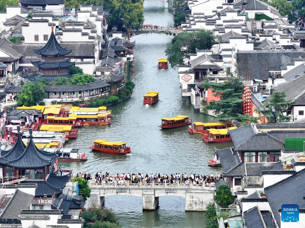 Vista aérea tomada con un dron el 1 de octubre de 2025 de personas visitando el área escénica del Templo de Confucio, en Nanjing, en la provincia de Jiangsu, en el este de China. China registró 888 millones de viajes turísticos dentro del territorio nacional durante los ocho días de vacaciones con motivo del Día Nacional y el Festival del Medio Otoño, lo que constituye un aumento de 123 millones frente a las vacaciones de siete días del Día Nacional en 2024, informó hoy jueves el Ministerio de Cultura y Turismo. (Xinhua/Liu Jianhua)