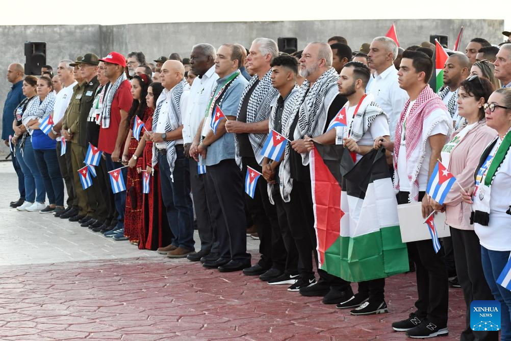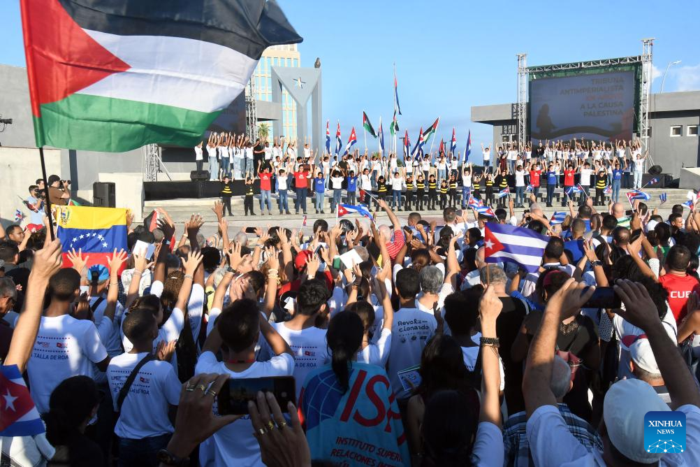 LA HABANA, 9 oct (Xinhua) -- Miles de cubanos se movilizaron hoy jueves en la ciudad de La Habana en favor de la causa palestina y contra el genocidio de Israel en la Franja de Gaza, en Medio Oriente.