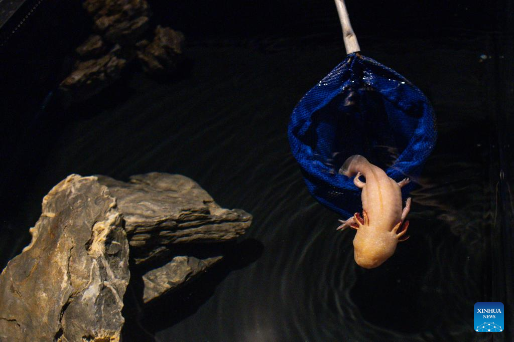 RIO DE JANEIRO, 9 octubre, 2025 (Xinhua) -- Imagen del 8 de octubre de 2025 de un un ajolote siendo regresado a su tanque luego de ser pesado y medido en el BioParque do Rio, en Río de Janeiro, Brasil. En los últimos días, se abrió al público la recién inaugurada área de exhibición de ajolotes en el BioParque do Rio, con 22 ejemplares, incluyendo 8 rescatados durante operativos contra el tráfico de fauna silvestre. (Xinhua/Claudia Martini)