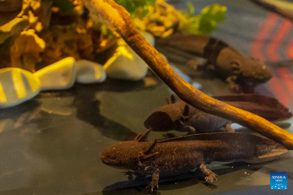 RIO DE JANEIRO, 9 octubre, 2025 (Xinhua) -- Imagen del 8 de octubre de 2025 de ajolotes nadando en su nuevo tanque en el BioParque do Rio, en Río de Janeiro, Brasil. En los últimos días, se abrió al público la recién inaugurada área de exhibición de ajolotes en el BioParque do Rio, con 22 ejemplares, incluyendo 8 rescatados durante operativos contra el tráfico de fauna silvestre. (Xinhua/Claudia Martini)