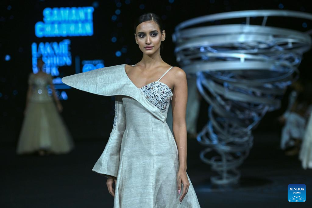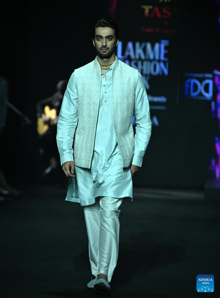 NUEVA DELHI, 10 octubre, 2025 (Xinhua) -- Un modelo presenta una creación de la marca india Tasva durante la Semana de la Moda Lakme x FDCI, en Nueva Delhi, India, el 10 de octubre de 2025. (Xinhua/Javed Dar)