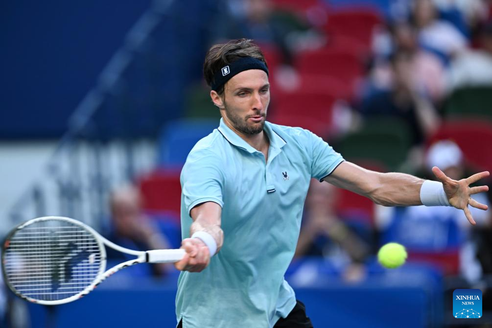 SHANGHAI, 10 octubre, 2025 (Xinhua) -- Arthur Rinderknech, de Francia, devuelve la pelota a Felix Auger-Aliassime, de Canadá, durante el partido de cuartos de final de individuales masculinos en el torneo de tenis Masters de Shanghai del ATP World Tour, en Shanghai, en el este de China, el 10 de octubre de 2025. (Xinhua/Chen Haoming)